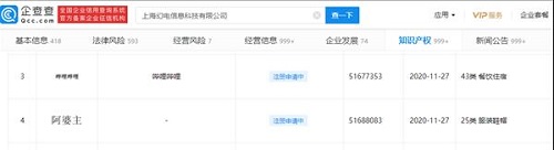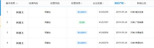 去年9月,就有餐飲公司拿到了“阿婆主”的商標,商標分類是“廣告銷售”。