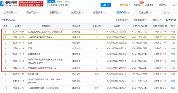 比亞迪汽車工業(yè)有限公司1月19日發(fā)布7個(gè)與口罩相關(guān)的專利申請,包括兩個(gè)口罩外觀專利,一個(gè)口罩打釘結(jié)構(gòu)、打釘機(jī)以及頭戴式口罩專利,一個(gè)耳帶調(diào)節(jié)器及口罩組件實(shí)用新型專利,一個(gè)口罩包裝組件專利,一個(gè)用于口罩紗布上料機(jī)的張緊力調(diào)節(jié)裝置及口罩紗布上料機(jī)的專利,一個(gè)口罩繩帶過線裝置及口罩生產(chǎn)線專利。