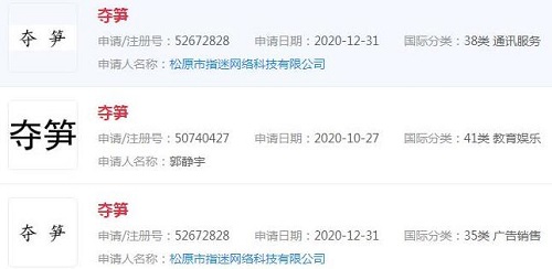 據(jù)企查查數(shù)據(jù)顯示,“迷人的郭老師”語(yǔ)錄“奪筍”已被松原市指迷網(wǎng)絡(luò)科技有限公司、自然人郭靜宇申請(qǐng)注冊(cè)成商標(biāo),申請(qǐng)日期為2020年10月27日和12月31日,商標(biāo)注冊(cè)分類涉及廣告銷售、教育娛樂、通訊服務(wù),商標(biāo)狀態(tài)為“商標(biāo)申請(qǐng)中”。