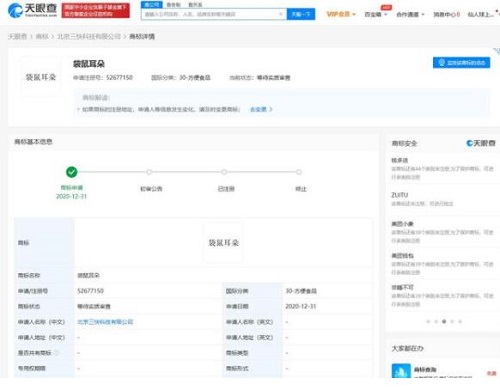 北京三快科技有限公司于近日申請(qǐng)注冊(cè)“袋鼠耳朵”商標(biāo),涉及國際商標(biāo)注冊(cè)分類有紐扣拉鏈、食品、方便食品,目前商標(biāo)狀態(tài)為等待實(shí)質(zhì)審查、商標(biāo)申請(qǐng)中。