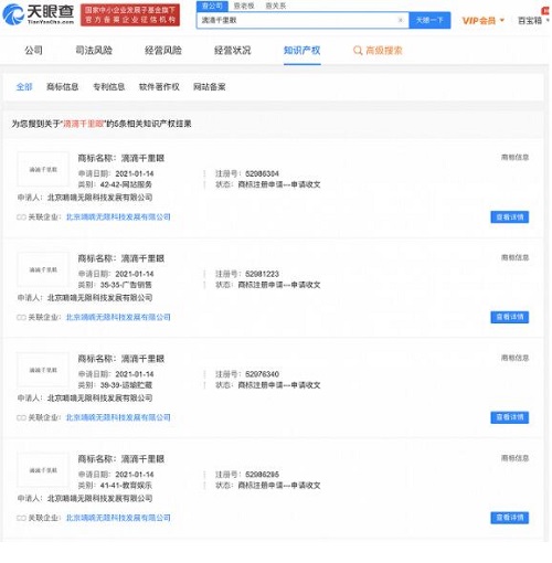 1月14日,北京嘀嘀無限科技發(fā)展有限公司申請(qǐng)注冊(cè)“滴滴千里眼”商標(biāo),申請(qǐng)日期為2021年1月14日,國際商標(biāo)注冊(cè)分類為通訊服務(wù)、網(wǎng)站服務(wù)、廣告銷售、運(yùn)輸貯藏,目前商標(biāo)狀態(tài)顯示為“商標(biāo)申請(qǐng)中”。