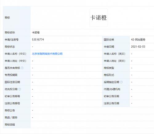天眼查APP顯示,近日,字節(jié)跳動關聯(lián)公司北京字跳網(wǎng)絡技術有限公司申請多個“卡諾橙”商標,國際商標注冊分類涉及通訊服務、科學儀器、食品等,商標狀態(tài)為“商標申請中”。