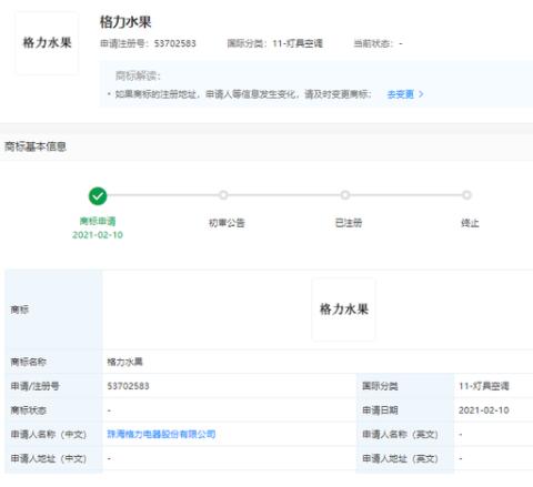 近日珠海格力電器股份有限公司申請注冊“格力水果”商標,申請日期為2021年2月10日,涉國際商標分類為11-燈具空調(diào),商標狀態(tài)顯示為“商標申請中”。