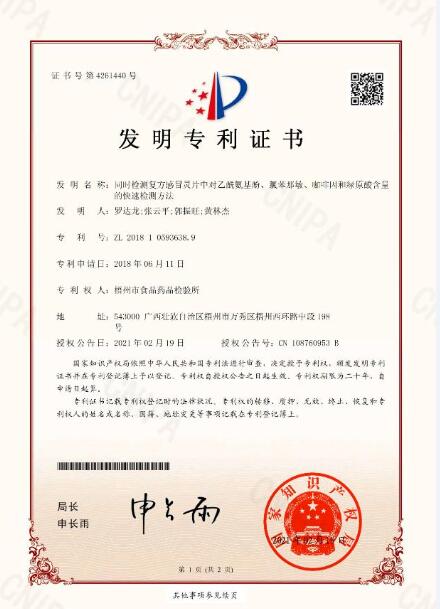 近期,梧州市食品藥品檢驗所再獲得一項發(fā)明專利“同時檢測復方感冒靈片中對乙酰氨基酚、氯苯那敏、咖啡因和綠原酸含量的快速檢測方法”,此項專利是我所科研創(chuàng)新的有效實踐,代表我所科研技術的又一次騰飛。