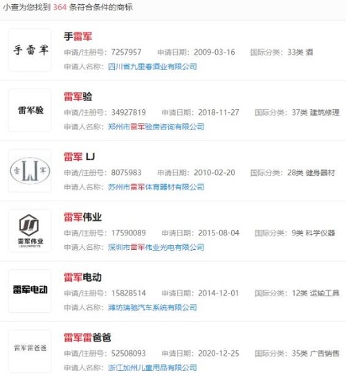 目前有關(guān) “雷軍”商標(biāo)申請(qǐng)記錄共 364 條,其中包含多家公司搶注申請(qǐng),搶注商標(biāo)名稱包含冠雷軍、手雷軍、雷軍驗(yàn)、雷軍電動(dòng)、雷軍雷爸爸等。
