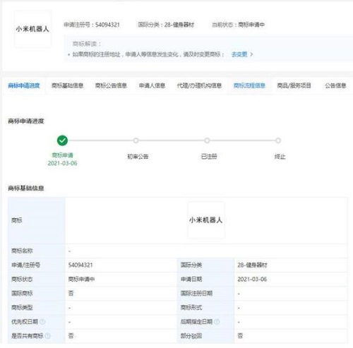 近日,小米科技有限責(zé)任公司申請注冊“小米機器人”商標(biāo),申請日期為3月6日,國際商標(biāo)分類為健身器材,當(dāng)前商標(biāo)狀態(tài)為“商標(biāo)申請中”。