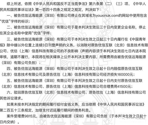 中國(guó)裁判文書(shū)網(wǎng)日前披露優(yōu)估(上海)信息科技有限公司等與優(yōu)信遠(yuǎn)海能源(深圳)有限公司仿冒糾紛一審民事判決書(shū),北京市朝陽(yáng)區(qū)人民法院判令優(yōu)信遠(yuǎn)海公司停止使用“優(yōu)信”字樣,賠償優(yōu)信公司共20余萬(wàn)元。