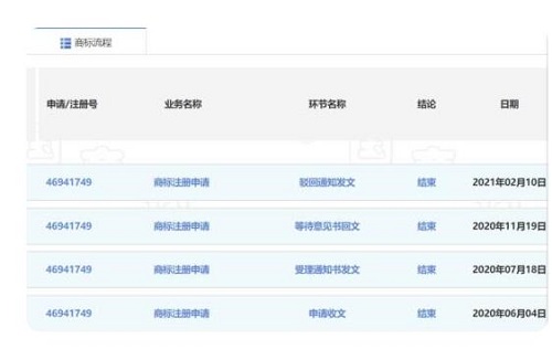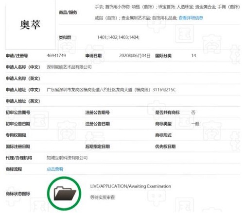 為了進一步了解、核實情況,中國市場監(jiān)管報記者登錄中國商標網(wǎng),申請人一欄輸入“深圳賦能藝術品有限公司”字樣,點擊第46941749號“奧萃”商標,隨即打開的頁面顯示該商標申請日期為2020年6月4日,使用商品為第14類;商標流程頁面顯示該商標注冊申請于2021年2月10日被駁回。