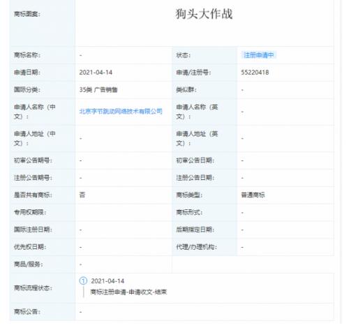 近日,北京字節(jié)跳動網(wǎng)絡(luò)技術(shù)有限公司新增“狗頭”、“狗頭大作戰(zhàn)”相關(guān)商標申請信息,國際分類涉及設(shè)計研究、廣告銷售、科學(xué)儀器、通訊服務(wù)等。目前商標狀態(tài)均為“注冊申請中”。
