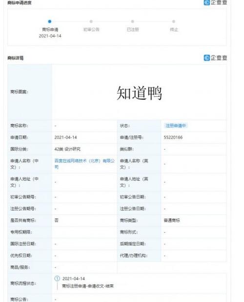 近日,百度在線網(wǎng)絡(luò)技術(shù)(北京)有限公司新增“知道鴨”商標(biāo)申請(qǐng)信息,國際分類為設(shè)計(jì)研究,商標(biāo)狀態(tài)為“注冊(cè)申請(qǐng)中”。