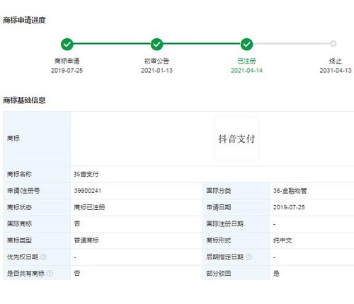 近日,北京字跳網(wǎng)絡(luò)技術(shù)有限公司申請(qǐng)的金融物管類“抖音支付”“抖分期”“抖享付”商標(biāo)陸續(xù)完成注冊(cè)。