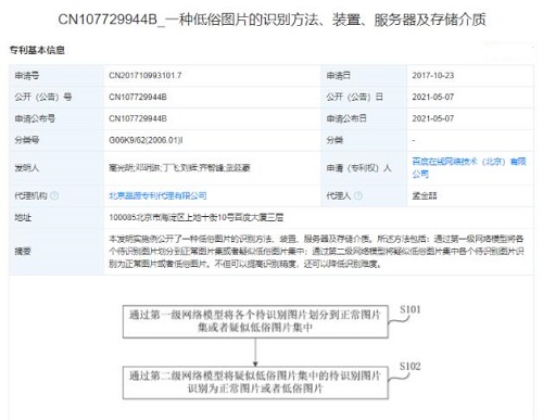 近日,百度在線網(wǎng)絡(luò)技術(shù)(北京)有限公司獲得“一種低俗圖片的識別方法、裝置、服務(wù)器及存儲介質(zhì)”的發(fā)明專利授權(quán),公告號CN107729944B,申請日期為2017年10月。