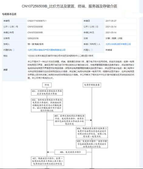 近日,北京小米移動(dòng)軟件有限公司獲得一項(xiàng)“比價(jià)方法及裝置、終端、服務(wù)器及存儲(chǔ)介質(zhì)”發(fā)明專利授權(quán),公告號(hào)CN107256509B,申請(qǐng)日期為2017年5月。