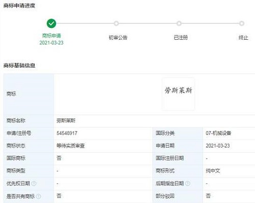 此外,“勞斯萊斯”相關(guān)商標已被多個公司及自然人申請注冊,國際分類涉及機械設(shè)備、健身器材等,當前商標狀態(tài)多為“等待實質(zhì)審查”。