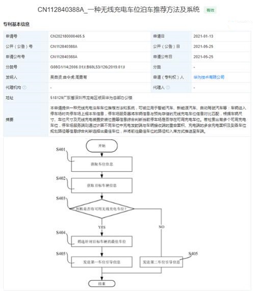 5月25日,華為技術(shù)有限公司公開(kāi)“一種無(wú)線(xiàn)充電車(chē)位泊車(chē)推薦方法及系統(tǒng)”專(zhuān)利,公開(kāi)號(hào)為CN112840388A。