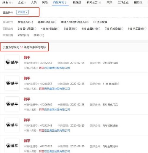 阿里巴巴目前共申請注冊躺平商標91次,其中56個商標已注冊,包含躺平、躺平設計家、躺大平。其中早在2018年12月阿里巴巴就曾注冊躺平商標并開發(fā)相關應用。