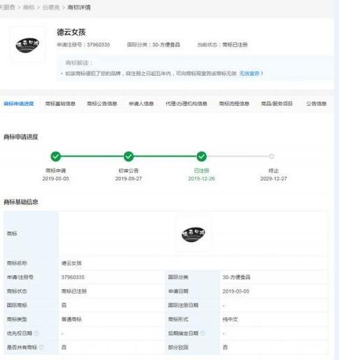 “德云女孩”商標已被多家公司及自然人申請注冊,申請人包括杭州臉枕科技有限公司、谷德亮等,國際分類涉及樂器、方便食品、飼料種籽等,商標狀態(tài)多為“商標已注冊”“等待實質(zhì)審查”。