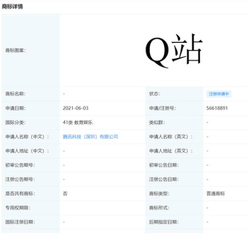 近日,騰訊科技(深圳)有限公司申請注冊“Q 站”商標(biāo),國際分類涉及網(wǎng)站服務(wù)、教育娛樂、廣告銷售等,目前商標(biāo)狀態(tài)為注冊申請中。