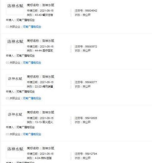 河南廣播電視臺(tái)申請(qǐng)注冊(cè)多個(gè)“洛神水賦”商標(biāo),國(guó)際分類涉及餐飲住宿、方便食品、通訊服務(wù)等,當(dāng)前商標(biāo)狀態(tài)為商標(biāo)申請(qǐng)中。