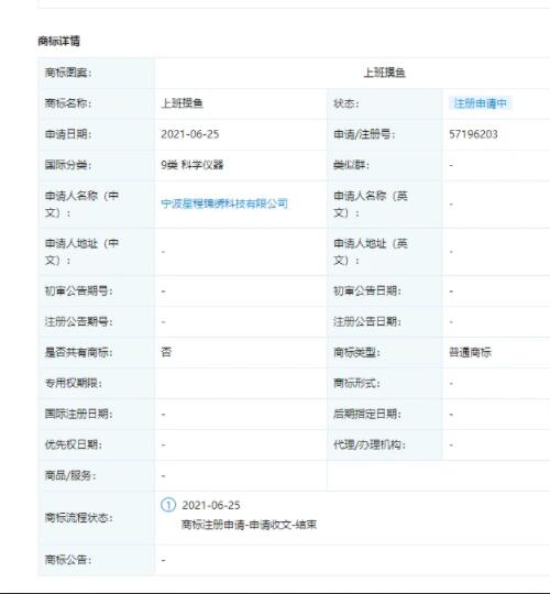 近日,寧波星程錦繡科技有限公司申請(qǐng)注冊(cè)“上班摸魚”商標(biāo),國(guó)際分類涉9類 科學(xué)儀器,目前商標(biāo)狀態(tài)為“注冊(cè)申請(qǐng)中”。