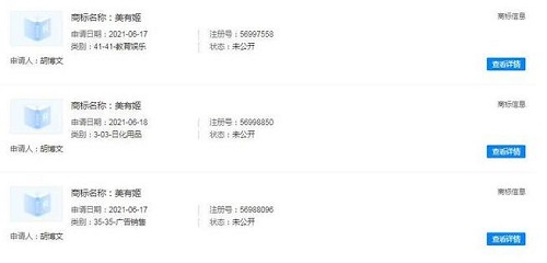 “美有姬”商標已被自然人胡某搶注,國際分類含廣告銷售、教育娛樂、日化用品,申請日期為2021年6月,當前商標狀態(tài)為申請中。