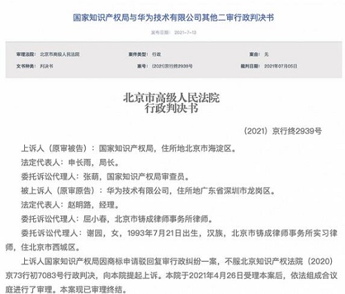 據(jù)北京法院審判信息網(wǎng)消息,7 月 13 日,國家知識(shí)產(chǎn)權(quán)局與華為技術(shù)有限公司其他二審行政判決書公開,案號(hào)(2021)京行終 2939 號(hào),審理法院為北京市高級(jí)人民法院,裁判結(jié)果為駁回上訴,維持原判。