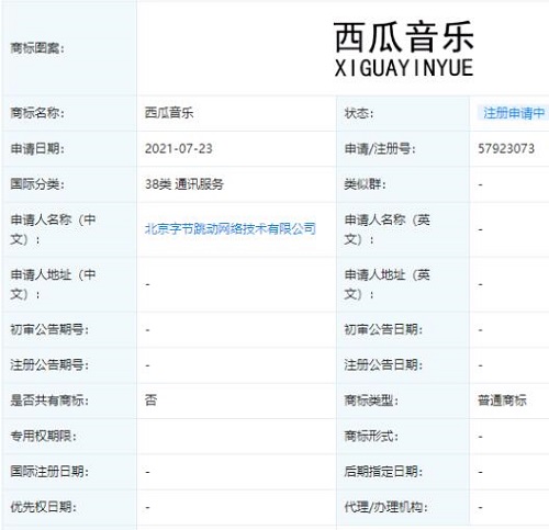 近日,字節(jié)跳動(dòng)公司新增“西瓜音樂”商標(biāo)申請(qǐng)信息,國際分類為通訊服務(wù),目前商標(biāo)狀態(tài)為“注冊(cè)申請(qǐng)中”。