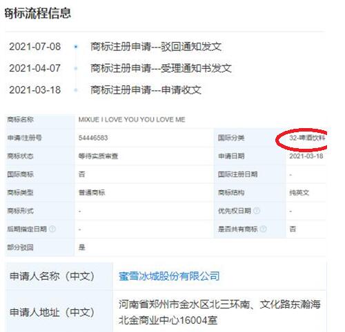 近期,蜜雪冰城股份有限公司申請(qǐng)注冊(cè)的“MIXUE I LOVE YOU YOU LOVE ME”商標(biāo)被駁回,國際分類涉及啤酒飲料、廣告銷售。