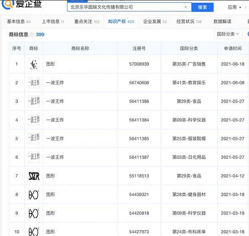 北京樂華圓娛文化傳播有限公司成立于2009年7月,法人代表杜華,注冊資本1.1億人民幣,經(jīng)營范圍包括組織文化藝術(shù)交流活動、技術(shù)推廣服務、投資咨詢等。商標信息顯示,北京樂華圓娛文化傳播有限公司在2020年11月起已申請多個“一波王炸”商標,其中部分商標還在注冊中。