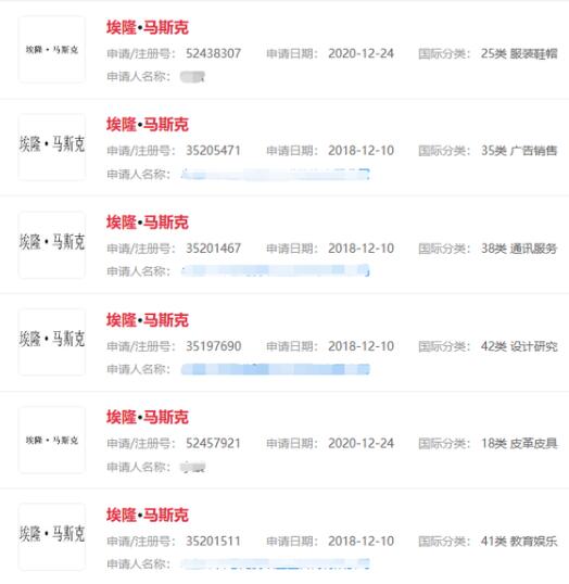 馬斯克原名“埃隆馬斯克”已被多方注冊成商標(biāo),國際分類涉服裝鞋帽、皮革皮具等。