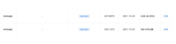 百度在線網(wǎng)絡(luò)技術(shù) (北京) 有限公司申請(qǐng)注冊(cè)“ metaapp ”商標(biāo),國(guó)際分類涉及網(wǎng)站服務(wù)、科學(xué)儀器等。目前商標(biāo)狀態(tài)均為申請(qǐng)中,申請(qǐng)時(shí)間是 10 月 29 日,也就是 Facebook 宣布改名的當(dāng)天。