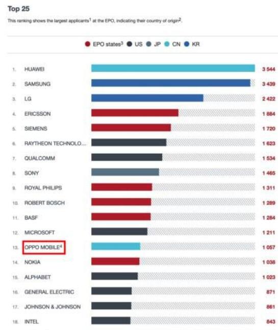 近日據(jù)外媒報(bào),歐洲專利局(EPO)正式公布了《2021 年度專利報(bào)告》,統(tǒng)計(jì)了全球科技廠商在過(guò)去的一年內(nèi)申請(qǐng)的專利數(shù)目。Top 25 中共出現(xiàn)華為、OPPO、中興、百度四家國(guó)企,其中 OPPO 以 1057 件專利申請(qǐng)次數(shù)排名總榜第 13 位。