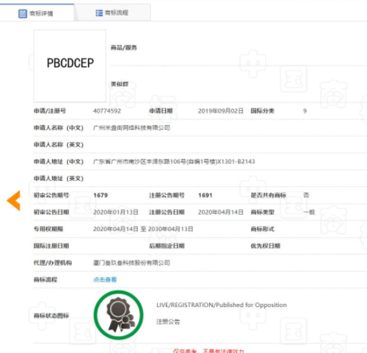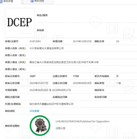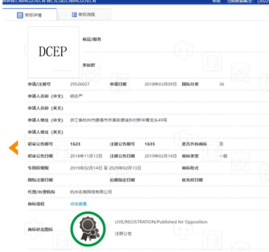 2018年3月9日以來(lái),自然人胡志嚴(yán)在第36類,呼倫貝爾首善投資管理有限公司在第3類、第9類、第25類、第35類、第36類、第41類、第42類和第43類,廣州米盤街網(wǎng)絡(luò)科技有限公司在第3類、第9類、第18類、第20類、第25類、第33類、第35類、第36類、第38類、第42類和第43類,大興安嶺星光大道食品有限公司在第29類和第32類,福州旗盛醫(yī)藥科技有限公司在第11類、第12類、第18類、第30類和第33類,時(shí)技科投資發(fā)展(深圳)有限公司在第14類,江西頌顏商貿(mào)有限公司在第35類和第38類,廣州趣家科技有限公司在第9類和第42類共獲準(zhǔn)注冊(cè)“DCEP”“ECNY”“PBCDCEP”等29件與數(shù)字人民幣相關(guān)的商標(biāo)。