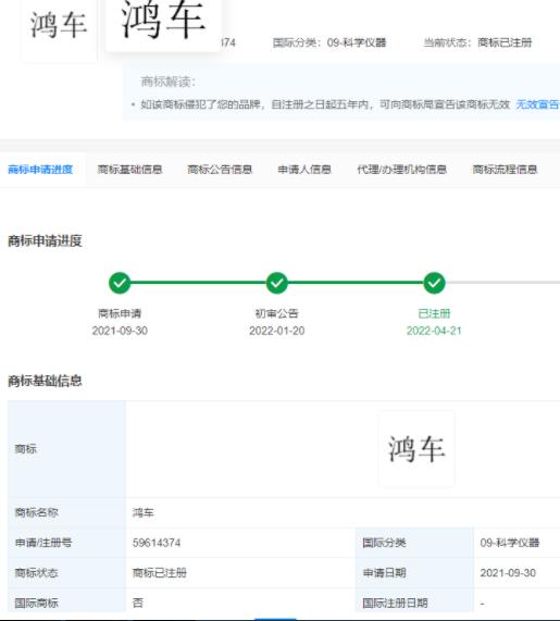 4月21日消息,華為技術有限公司申請注冊的“鴻車”商標注冊成功,國際分類涉及科學儀器、網(wǎng)站服務,申請日期為2021年9月。