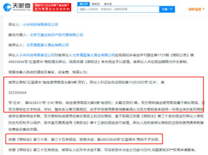 文書詳情顯示,小米科技有限責(zé)任公司對北京酒國演義酒業(yè)有限公司申請的“紅藍(lán)綠米”商標(biāo)提出異議。商標(biāo)局審查認(rèn)為,被異議商標(biāo)指定使用商品為“耳機(jī)”,與異議人引證在先注冊的“紅米”“小米”商標(biāo)核定使用的“電視機(jī);頭戴式耳機(jī)”等屬于類似商品,且雙方商標(biāo)在文字構(gòu)成、呼叫、整體含義等方面相近,如予并存使用易使消費(fèi)者誤認(rèn),因此,依據(jù)商標(biāo)法規(guī)定,對第48833848號“紅藍(lán)綠米”商標(biāo)不予注冊。