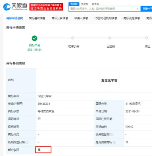 天眼查App顯示,近日,阿里巴巴新加坡控股有限公司申請注冊的“淘寶元宇宙”“阿里元宇宙”商標,流程狀態(tài)均變更為“駁回通知發(fā)文”,被駁回商標國際分類包括廣告銷售、科學(xué)儀器、通訊服務(wù)等,均申請注冊于2021年9月。