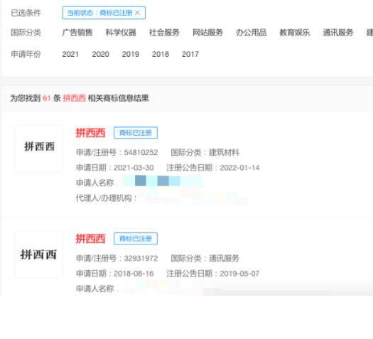 天眼查App顯示,目前注冊(cè)成功的“拼西西”商標(biāo)已經(jīng)有61個(gè),范圍涉及服裝鞋帽、辦公用品、教育娛樂(lè)等多個(gè)種類。