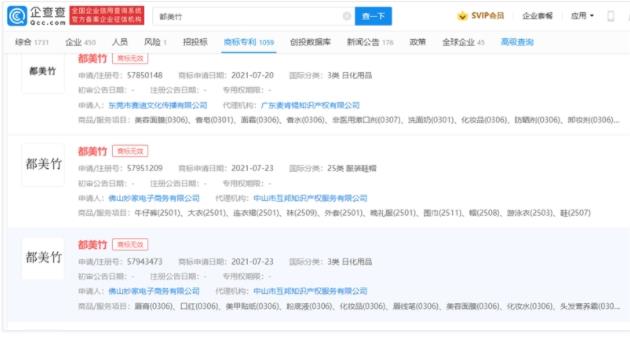 企查查APP顯示,多個自然人及公司申請的“都美竹”商標(biāo)被駁回,商標(biāo)狀態(tài)顯示為商標(biāo)無效。商標(biāo)分類包括服裝鞋帽、方便食品、日化用品等。