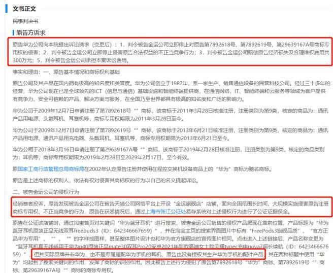 企查查APP顯示,近日,浙江省杭州市余杭區(qū)人民法院公布一起侵權(quán)華為商標(biāo)及不正當(dāng)競爭糾紛的案件。華為技術(shù)有限公司經(jīng)消費(fèi)者投訴,發(fā)現(xiàn)被告深圳市金運(yùn)視訊設(shè)備有限公司在其網(wǎng)店中銷售未經(jīng)授權(quán)的多款華為耳機(jī),面向全國范圍長時間、大規(guī)模實(shí)施侵害原告注冊的“華為”“HUAWEI”“FREEBUDS”商標(biāo)專用權(quán)。