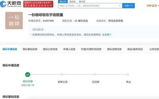 天眼查APP顯示,5月18日,華為技術有限公司申請注冊“一標咖啡吸收宇宙能量”商標,國際分類為43-餐飲住宿,商標狀態(tài)為等待實質審查。