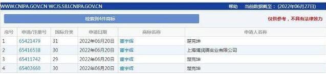 據國家知識產權局商標局官網,“董宇輝”商標近日被上海博潤騰實業(yè)有限公司、自然人楚克坤申請注冊,國際分類包括咖啡、茶、米面、巧克力、糕點甜食等,查詢商標詳情顯示:此商標正等待受理,暫無法查詢詳細信息。