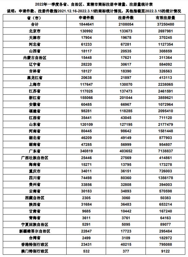 根據(jù)統(tǒng)計表數(shù)據(jù)顯示,2022年一季度全國商標申請量達1,844,641件,注冊量達2,108,054件。截至3月15日,我國有效商標注冊量為37,250,480件!