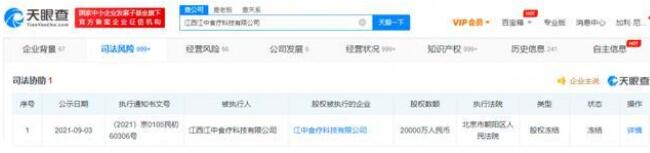 天眼查App顯示,江西江中食療科技有限公司成立于2011年5月,注冊資本約10.48億人民幣,法定代表人劉家清,經(jīng)營范圍包括預(yù)包裝食品的批發(fā)零售;保健食品的批發(fā)零售等。風(fēng)險信息顯示,去年9月,該公司因涉及合同糾紛被凍結(jié)所持江中食療科技有限公司2億人民幣股權(quán)。