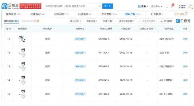 企查查APP顯示,近日,中國貴州茅臺酒廠(集團(tuán))有限責(zé)任公司申請注冊多個圖形商標(biāo),圖形為古風(fēng)漫畫人物和疑似靈獸形象,國際分類涉及酒類、廣告銷售、運(yùn)輸工具等,當(dāng)前商標(biāo)狀態(tài)均為“注冊申請中”。