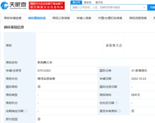 天眼查App顯示,近日,騰訊科技(深圳)有限公司申請注冊“新街舞大會”商標(biāo),國際分類為廣告銷售、教育娛樂,當(dāng)前商標(biāo)狀態(tài)為等待實質(zhì)審查。