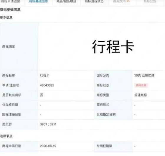 企查查App顯示,上海一科技公司曾申請(qǐng)注冊(cè)一枚“行程卡”商標(biāo),國(guó)際分類包括39類運(yùn)輸貯藏,商品服務(wù)項(xiàng)目包括旅行指南服務(wù)、機(jī)票預(yù)訂服務(wù)、導(dǎo)航等,該商標(biāo)申請(qǐng)于2020年8月,2021年3月,該商標(biāo)被駁回。