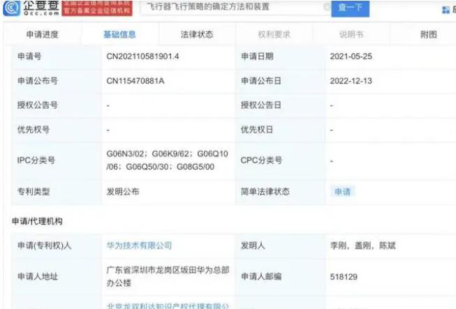 企查查APP顯示,近日,華為技術有限公司“飛行器飛行策略的確定方法和裝置”專利公布。