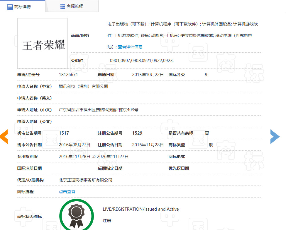 2018年6月19日,騰訊公司以侵犯其在先著作權為由,向原國家工商行政管理總局商標評審委員(下稱原商評委)會對上述商標提出無效宣告請求,其認為訴爭商標與騰訊公司的第18126671號“王者榮耀”商標(下稱引證商標)構成使用在類似商品上的近似商標,易使公眾誤認,依據(jù)商標法第七條、第十條第一款第(七)項、第三十條、第三十二條以及第四十四條之規(guī)定,請求對訴爭商標予以無效宣告。據(jù)查,引證商標于2015年10月22日申請注冊,2016年11月28日被核準注冊使用在電子出版物(可下載)、 計算機程序(可下載軟件)、 計算機外圍設備等第9類商品上。