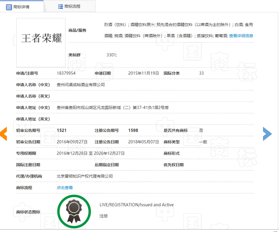 2015年11月19日,貴州問渠成裕酒業(yè)有限公司(下稱問渠酒業(yè))申請注冊第18379954號“王者榮耀”商標(下稱訴爭商標),指定使用在第33類烈酒(飲料)、燒酒、酒精飲料(啤酒除外)、果酒(含酒精)等商品上,期間商標被提起異議,不過最終于2018年5月7日被核準注冊。